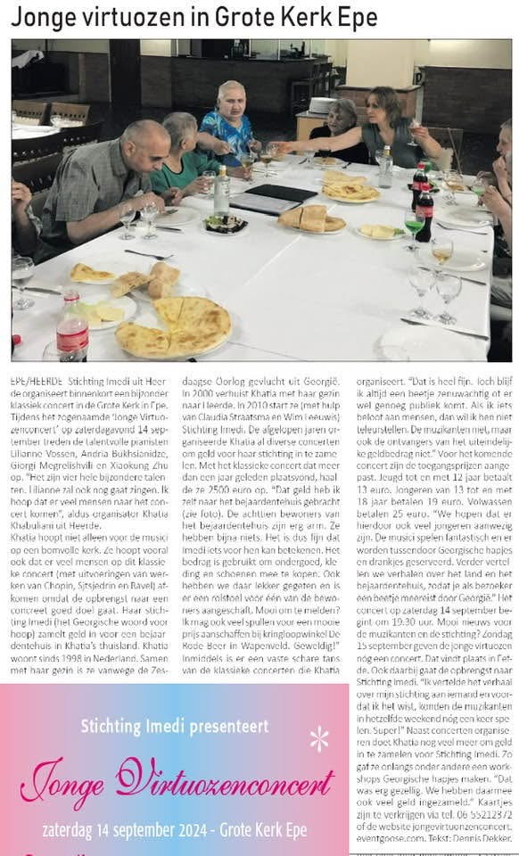 Bij Stichting Imedi organiseren wij culturele en muzikale evenementen om aandacht te vragen voor ouderen in Georgië. Met concerten, workshops en culturele bijeenkomsten brengen wij mensen samen en zetten wij ons in voor steun, verbinding en hoop.